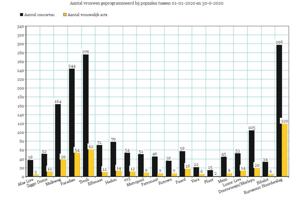 Achteraf begint er toch iets te knagen. Op het festival staan best veel vrouwelijke artiesten, maar zijn ze ook zo lekker bezig bij de popzaal? Graag check ik of dat echt zo is. Het nieuwe jaar staat voor de deur, dus dat betekent: nieuw jaar, nieuwe kansen. Bij de achttien grootste popzalen van Nederland heb ik een blik in de agenda geworpen. ’t Paard in Den Haag is op het gebied van het boeken van vrouwen koploper van de popzalen. 31 Procent van de programmering is tot nu toe vrouwelijk. Een redelijk percentage, wat zeker nog kan groeien. Maar het tegenovergestelde geluid is toch harder: bij de helft van de onderzochte zalen komt het percentage niet hoger dan 18 procent. Vergelijkbaar met de Top 2000 dus.