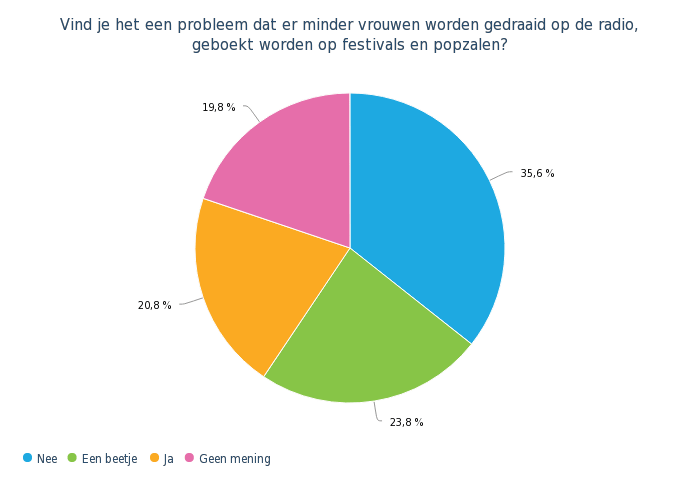 Zwart-wit is deze situatie dus niet. Net zoals in andere takken rijst de vraag of positieve discriminatie wel iets is om na te streven. Ik besluit een onderzoek te doen onder luisteraars en daar reageren 180 mensen op. Wat blijkt? Ook het luisterende publiek is hier nog niet over uit. Bijna tachtig procent van de ondervraagde muziekliefhebbers luistert dagelijks of meerdere keren per week naar muziek. Opvallend is dat meer dan een derde van de ondervraagden de ondervertegenwoordiging van vrouwen in de muziek niet erg vindt. Maar twintig procent vindt dit echt een probleem.